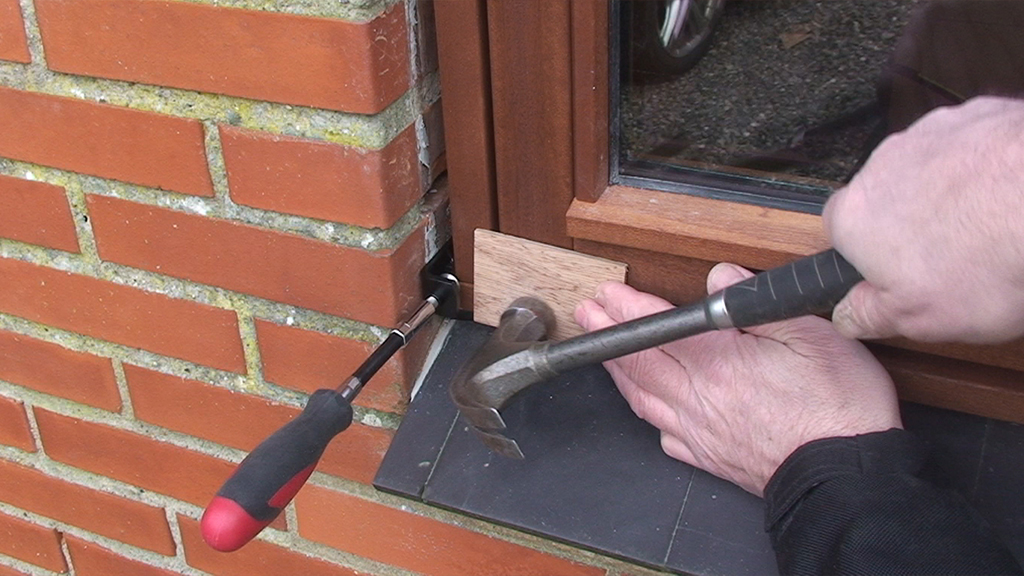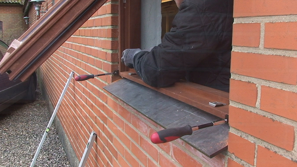Hier wird eine Außentür in einem holzverkleideten Ziegelsteinhaus montiert. Beachten Sie, wie einfach das Justieren und Erzielen eines perfekten Resultats für ihn ist.